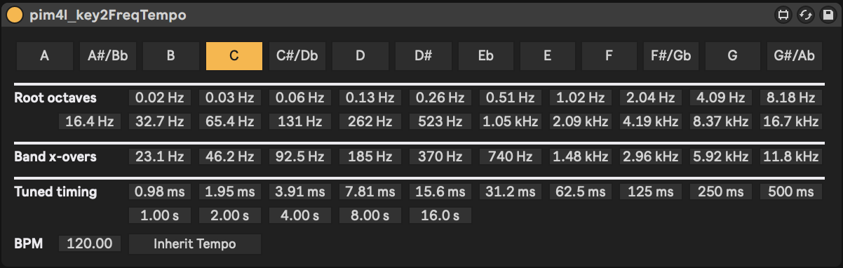 | Description: | As part of developing my ever more obsessively parametric setup, I made this stupid little utility that lets you select a key/note and calculates all the possibly useful octave frequencies of the root, the corresponding crossovers between them, their equivalent time-period values, and finally a corresponding BPM value, which can be used to automatically set the Live Set's tempo. |