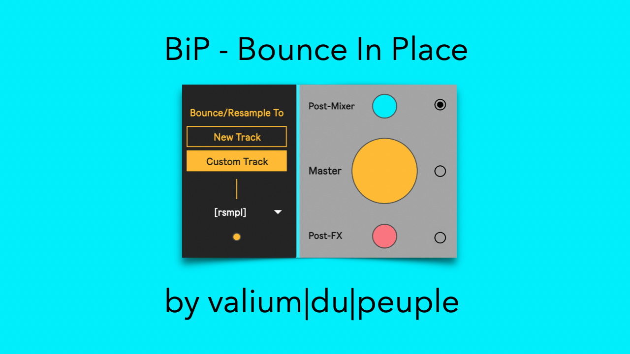 - THE DESTINATION TRACK NAME IS NOW PREPEND WITH "[BIP]" IF IT'S A SINGLE TRACK BOUNCE; WITH"[RSMPL]" IF IT'S A MULTITRACK BOUNCE.