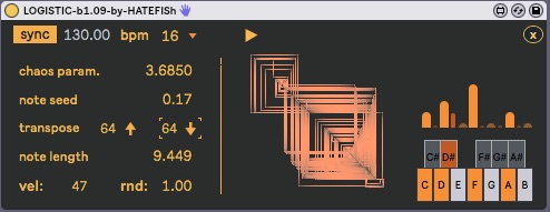 | Description: | sequencer based upon the logistic equation. chaos under your thumb. v 1.09: The current version (beta-1.09) adds a lot of new features. You may find a detailed list in the "URL" section below, or you can listen logistic in action here: https://soundcloud.com/hatefish/droom v 1.03: - better sync with Live - lovely start/stop button in Live style - note subdivision for a more expressive experience. |