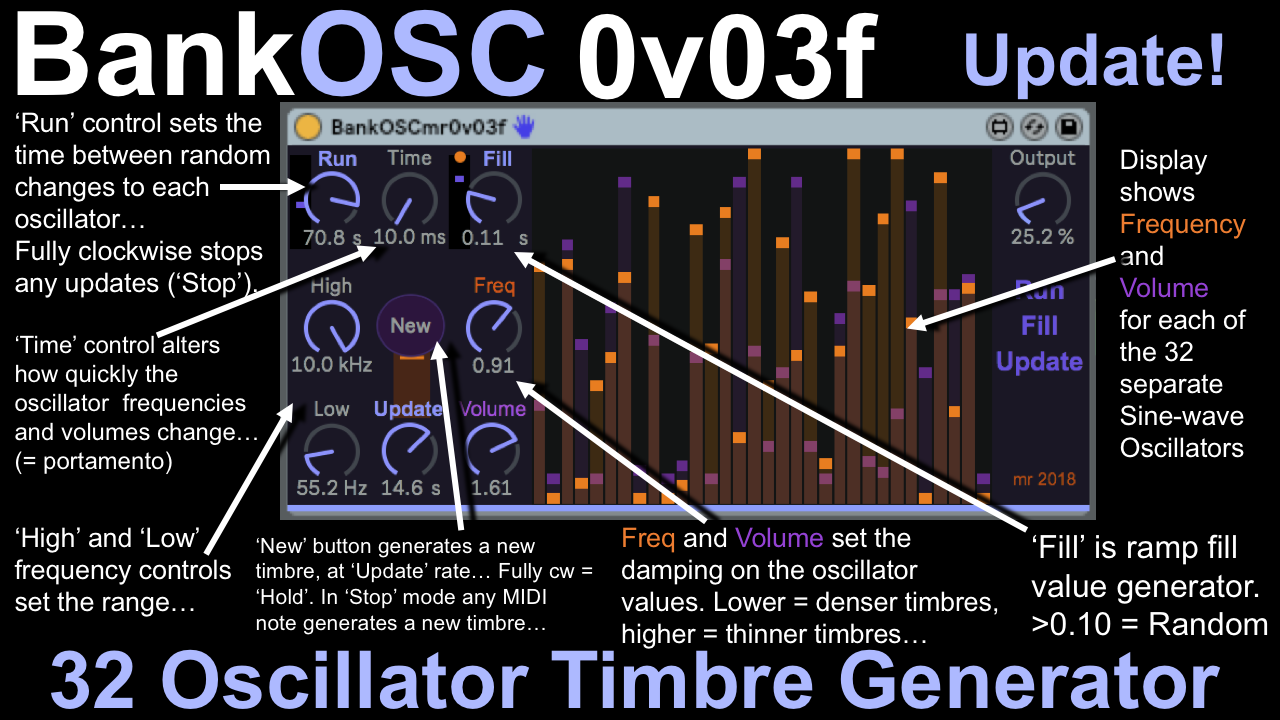 | Description: | BankOSCmr is a Sound Generator, not a synth, and the MIDI input is just about as limited as it is possible to be. It provides 32 sine-wave oscillators simultaneously... The display shows the 32 oscillators from left to right, and each vertical shows the frequency as an orange square and associated bar underneath, and shows the amplitude (the volume...) as a purple square and associated bar underneath. Low frequencies and amplitudes are at the bottom, and high frequencies and amplitudes are at the top. You can't edit the 32 oscillators directly from the display - the display is purely for display! To control the oscillators, the controls on the left affect: - the Rate at which the update sweeps across the oscillators from left to right - the High and Low extremes of the frequencies of the oscillators - the Time for the frequencies and amplitudes to change to the new values as it sweeps across... - a 'New' button (at the top of the Van De Graaf) to generate a new set of random values for frequency and amplitude (If you send a MIDI note to this device when the Rate is set to the slowest time (...all the way clock-wise: 'Run' changes to 'Stop'), then this triggers the 'New' button.) For version 0.03f, then the main new additions are the Freq and Volume 'damping' controls, and these affect the way that the density of the oscillator frequencies and volumes are affected by the scanning across the oscillators. Low values of damping create thick clusters of frequencies, whilst high values of damping give more open, thin wisps of frequencies. I also added a timed 'Update' function, which resets the frequencies and volumes of the oscillators to random values, just to add a bit of variety in how the oscillators can be controlled. 'Fill' is a ramp value generator: less than 0.10 = Random, despite what the graphic says! (The simple state-variable filter that provided low-pass, high-pass, band-pass and notch transfer functions, and had Frequency and Q controls... has gone. Sorry.) Oh, and finally an Output control with lots of range... BankOSCmr can produce a range of not-so-ordinary sounds, and this is the second draft of one of my irregular explorations into sound generation. I'm much happier with the range of sounds that this version can produce! Youtube live demo video (updated) of 0v03 is at: https://youtu.be/MP1e5vl5gp8 Youtube demo video of 0v01 is at: https://youtu.be/mTSEXFMNixE SoundCloud demo of 0v01 is at: https://soundcloud.com/martinruss/bankosc0v01demosounds First Blog (more details of UI): http://synthesizerwriter.blogspot.com/2018/07/my-first-visit-to-bank-of-oscillators.html After a report of Live crashing with version 0v01, I did some extended debugging and found a strange jsonwriter message sometimes appearing in the Max Console. I discussed this with Ableton and Cycling'74, and we were unable to consistently reproduce a crash, so I have implemented their suggestions to give the second release (0v02). The functionality was the same (so I didn't updated the screenshot!), but some of the object settings were tidied up and additional protection added. New functionality has now been added in 0v03... |