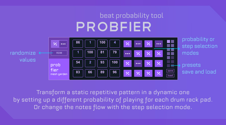 | Description: | Placed before a drum rack, Probfier gives you the ability to select between 2 modes per pad: Probability or Step selection. Choose Probability to apply a different probability of playing per pad, from 0 to 100%. Choose Step selection (from 1 to 8) to select which incoming note to play per pad: 1 will select each incoming note (the pattern stays the same) 2 will select the first of every 2 incoming notes 3 will select the first of every 3 incoming notes And so on for 4 5 6 7 8 Randomize values button included. Presets collections save and load. All parameters are mapped to Push knobs. v1 initial release v2 Live 10 compatibility (free update) v2.1 (free update) v2.2 Live 11 compatibility (free update) More info and demos at the link below. |