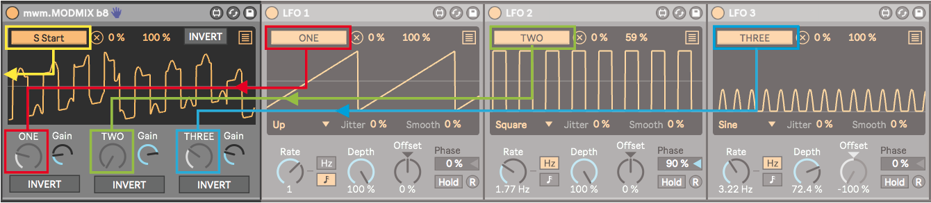 Description: Create complex modulations by mixing up to three modulation sources from other Max For Live devices like LFOs and Envelope Followers.