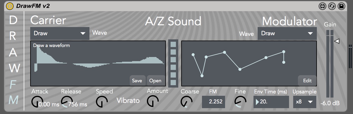 | Description: | DrawFM is a simple FM synthesizer with a focus on drawing both carrier and modulator waveforms. With a variety of controls such as modulator envelope time, amplitude envelopes and vibrato DrawFM provides a multitude of sound design options in a compact package. Supports up to 8 voices of polyphony. Video demo: https://youtu.be/PupA9EZ2GWo Manual here: https://drive.google.com/open?id=1MuBubtwUe4dmrZ6eWRE2lOagFM8Dp_S5 Designed by Alec Brady and Zach Howard |