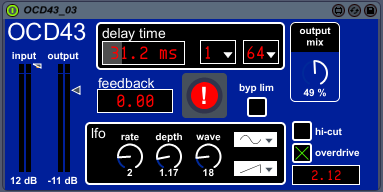 | Description: | Updated with some minor tweax, plus see the JavaScript below which is critical for this to work. The OCD43 is my attempt to reverse engineer the wonderful Lexicon PSP42 delay effect. I used the PSP Audio plugin as a guide, as well as the PCM42 hardware unit owner's manual. This was more of a learning experience than an attempt to create a carbon copy of the original. I intentionally left a lot of settings "under the hood", such as the overdrive, much of the LFO subsystem, the filters. Also I didn't implement phase inversion as is present on the PSP42. You can always open it up and change stuff if you don't like it, it IS MaxMSP after all! You can get all kinds of great delay sounds, from saturated dub echoes to flanger-like effects (set up the LFO on sine wave and try shorter delay times). Increasing the overdrive level will also boost the feedback. I constrained the input values to try and keep everything coherent. If you make any changes or have any ideas, please let me know! Some notes: there is a limiter on the output channel. The "wave" knob in the LFO section fades between the two selected waveforms. Some of the UI elements use the Envy Code R font (http://www.fontsquirrel.com/fonts/Envy-Code-R). the .JS file needs to be in your Max path. Copy the following code, save it someplace in your Max path as converter.js: var tempo = 0; var msv = 0; var sDivU = 0; var sDivL = 0; var div = .25; function list() { var a = arrayfromargs(arguments); tempo = a[0]; sDivU = a[1]; sDivL = a[2]; //post(a[0] + ", " + a[1] + ", " + a[2] /n); calculateTime(); } function calculateTime(){ if(!tempo || !div || !sDivU || !sDivL)return; var dTime=(60.0*1000.0*parseFloat(sDivU))/(parseFloat(tempo)*div*parseFloat(sDivL)) dTime=roundOff(dTime,2) msv=dTime bang(); } function roundOff(x,nrDec){ fact=Math.pow(10,nrDec) x=Math.round(x*fact) return(x/fact) } function calcTuplet(myForm){ var tuplet=myForm.selectTuplet[myForm.selectTuplet.selectedIndex].value var nr=myForm.number[myForm.number.selectedIndex].value var noemer=tuplet.substring(tuplet.indexOf("/")+1,tuplet.length) myForm.subdivisionLower.value=noemer myForm.subdivisionUpper.value=nr myForm.division.options[2].selected=true calculateTime(myForm) } function bang() { outlet(0, msv); } This is the Max abstraction that you can use with the script: <pre><code> ----------begin_max5_patcher---------- 1013.3oc6X0rbaCBD9ryL8cfwmc8Hjr9w8Vam9BzqYxjAKgSHQBzHgcSZl9t WXQRFEiRjicRyz1CFD6hWs7se6BnG9vYSltRbGsdJ5SnyQSl7fRxDPlVxjVA SlVPtKMmTCSbJm9CwpalNqQmjdmDjWRRuEgQ9nfNcqEbImTPA8ethQx6TURj oWy3WcYEMUZbfH+34dyP9ltnHXf2bOzE11ql8SvdXek9F47MELdNUBNXfkTw FYqXbqXVF3Np0vGiB67GyLk2WRMNyzonK.U+5Cmo6UcyNZH5lZTpfukVIoUG IHEpW9n3fWHHgO.Px+0AjxYaoyKn7McleKopCH5zdN9B2P023auG8UQFE88Q .X3X.vBLrpE1.VYEslxkDISv6ABkjJ0KSEqtjxIqxo8TtRTkQqRE4hJyKBCu F6l9wj0jTvBdNCTIGVfpijKqXizGHoRElt5Jqo6omztldS2hAf85.3qyk89+ IgII9Kl47odlqjkJ2T0VqYmbctwiW.C3Q1wIq.rO1aWj0U7ceV6Lyu04BhxH cSrlrklcIQpvzUajzcOU2viaIxZpZ9FpXcq7NE1jlZIsr1Nh2SKiukUyZXUN mgh7Wz3wXs6FnaB0Mw5lk6779+s6JEbENArm4NsLgyEM3XW5zTWSbCmIqk22 P8cZqBURsoTS77Al.CRq7bqtMt36FjXRUAQq7Om1n9ZQkb+RGNWREhrmyiyE 7qbTHx+hAM3StByY7a0laXtf1DpBYOAWYs3YBRCqFpSMnoynqeBs0kTZVNqn gK0Lilp86d3Ur7+wU6O16+09OxZ+32009CC92n1ue2F.KzMQ5lDcCFzfAA9f t.PxBPaDHYYzeGaUzrafAWrCyGyFJ3+banD7+MTNgannxn0IMCesJzWD4Yi4 tUwPWnoJTxf2sx6vJa66n5ZxxguakoBkJ8cEge0wbQKUULoZ2sQbGI7h1qS9 3KU9Ru7X7Sb4wiccMzsrU3VFX6imJDuDXBgmVlfSfJ3sGnjUDdcopR2I.ovK fchSdoIM9tgpkt9fDdCCULNjxzz0kBs+Ctl09XrYQnJYy26qjAPgVwiP9Zwl pzV2o8iLgrfiLZsjw6Nw4469JK1y5ZVVFk26LiErrRgxm6NG0vDhQ6b5i2gv OqyoWB9GhyEkj.EQLUThRBlG1L5z31di1swGjauHz1si75FcRbaMyEsXTt8A QEhhhsca0AgOon8i4ltca8dYuaYvwGb5UKC1C5hvA6OB6szBugQmjkT7nvaf L81i25MpddmK1+cryATlCiLXBwKMwa3qp2e.NxPLTGXHrYza4Bx6UaA0vsOY KnwU49EjtZpbiWFYmf1ezHRW0BTc+FrbUzPI -----------end_max5_patcher----------- </code></pre> |
