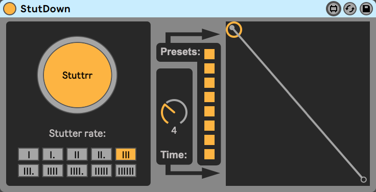 | Description: | Use this device to create granular pitch-downs and build-ups. You can set the envelope, envelope duration (from 1 to 10 seconds) and the stutter/granular rate, which is synchronised to Ableton Live tempo. 8 slots for user-defined presets are available. Usage: drop StutDown onto any MIDI or audio Ableton Live track, make some sound and press Stuttrr button to start granular pitch-down or build-up. If the envelope goes from 0 to 1, the pitch will go up. If the envelope goes from 1 to 0 the pitch will go down. An envelope set to a horizontal line will produce a static pitch. Click the envelope window to ctreate new points, shift-click to remove available points. Use Time dial change the envelope duration (from 1 to 10 seconds). The stutter rate buttons allows you to change the speed of the looping of the sound: the more vertical stripes - the faster is the granular effect. You can save up to 8 combinations of Stutter rate, Time Dial and Envelope in the Presets section. Shift-click the slot to save a preset, click to restore the preset. StutDown was tested to work in Ableton Live 10/Max 8.0.3 (macOS Mojave/Windows 10). Note, please, Max 8 (or later) is required to run StutDown. Short video: https://youtu.be/pfwoZ4jiBts Price: $1 Version 1.0 (Feb 2019) - Initial release Here you can view my other M4L devices: https://gumroad.com/valery_kondakoff |