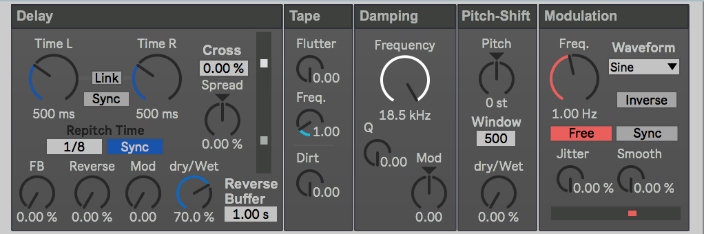 | Description: | Video: https://www.youtube.com/watch?v=V4ebRjKHop0&feature=youtu.be Download the device: https://gum.co/rDelay My other plugins: https://gumroad.com/jaromir rDelay is an analog style reverse delay plugin for Ableton made in Max for Live. The rDelay is a versatile delay device capable of swell delay sounds to destroying analog style delays sounds. The device includes multiple modules to shape sound and to to create new sounds. Features: -Delay Stereo delay from 0 to 5000ms can also be synced. -Re-Pitch adjustable re-pitch time can also be synced -Reverse real-time audio reversing -Tape Adds wobble and noise -Damping 24db Ladder filter in feedback path of the delay -Pitch Shift transpose from 24-/24+ semitones -Reverse Buffer Set the time that the reverse buffer records. Update 1.01 -added reverse buffer parameter -changed the panel colours to black |