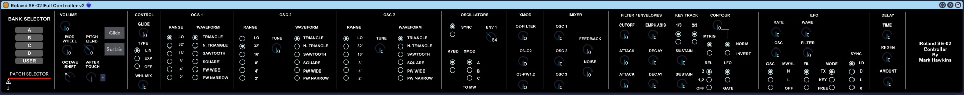 | Description: | This enables you to control all parameters available to you via Midi Control and Ableton. It also enables you you choose the Bank and Patch/Preset you are looking for on the Roland SE-02 (Studio Electronics) Boutique Synth. You choose the Bank - A, B, C, D or User, then you use the slider to go through the patches/presets. ( Please comment if you find any issues, or if you find it useful ) |