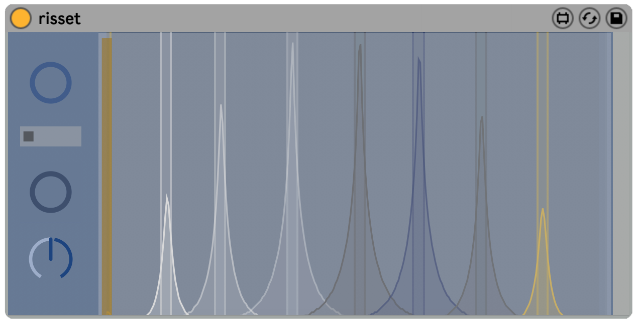 Risset for Live 10 modulates several frequency bands across the full-frequency spectrum with a controllable Q factor. Steps between each tone are continuous, forming a subjectively continuous glissando. The modulation speed may run independently or may be synchronized to your Live set. Complete with tah~ soft-clip distortion. |