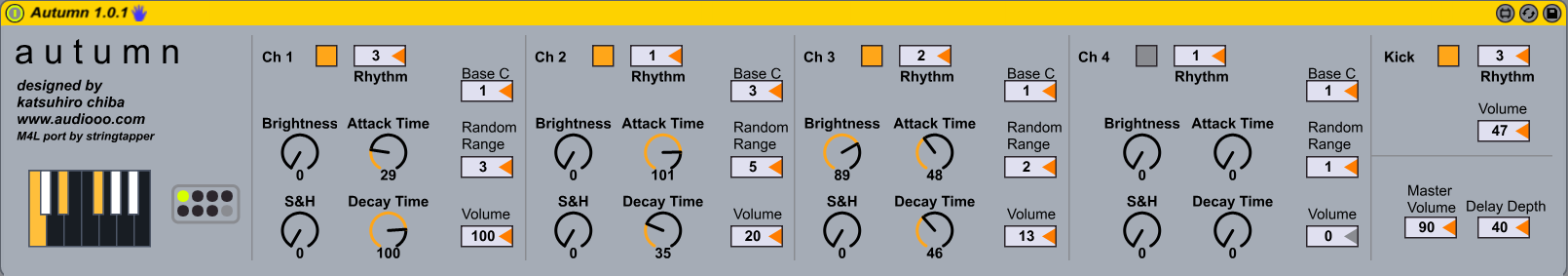 | Description: | Another great instrument by Katsuhiro Chiba now available as a Max for Live device! This instrument is built on another randomizing algorithm based on chord/scale input. Unlike Sev Autumn has four channels that can be controlled separately to produce a small ensemble of randomly generated synthesized sound. Like Sev it works best when triggered via MIDI clip with sustained chords. Thanks again to Katsuhiro Chiba for allowing the port. Any mods need to be attributed to Katsuhiro Chiba. UPDATE 1.0.1: Already changed the transport mechanism again so it has much better sync with Live's transport. Thanks to broc from the Ableton forum. |