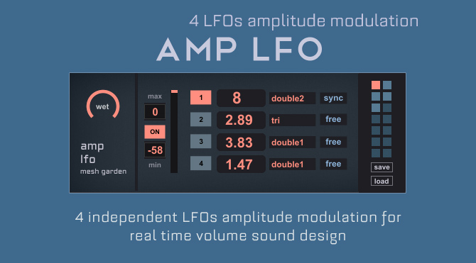 | Description: | 4 independent LFOs that control amplitude modulation. For each LFO you can set: -LFO frequency -LFO shape (7 types: sine - tri - square1 - square2 - spike - double1 - double2) -Synced or free mode The LFOs can be triggered one by one in real time with MIDI; the LFOs sequences can be saved into MIDI clips for editing and reuse with other sounds. Unlimited presets save/load 16 parameters already mapped to Push Audio and video demos at the link below. |