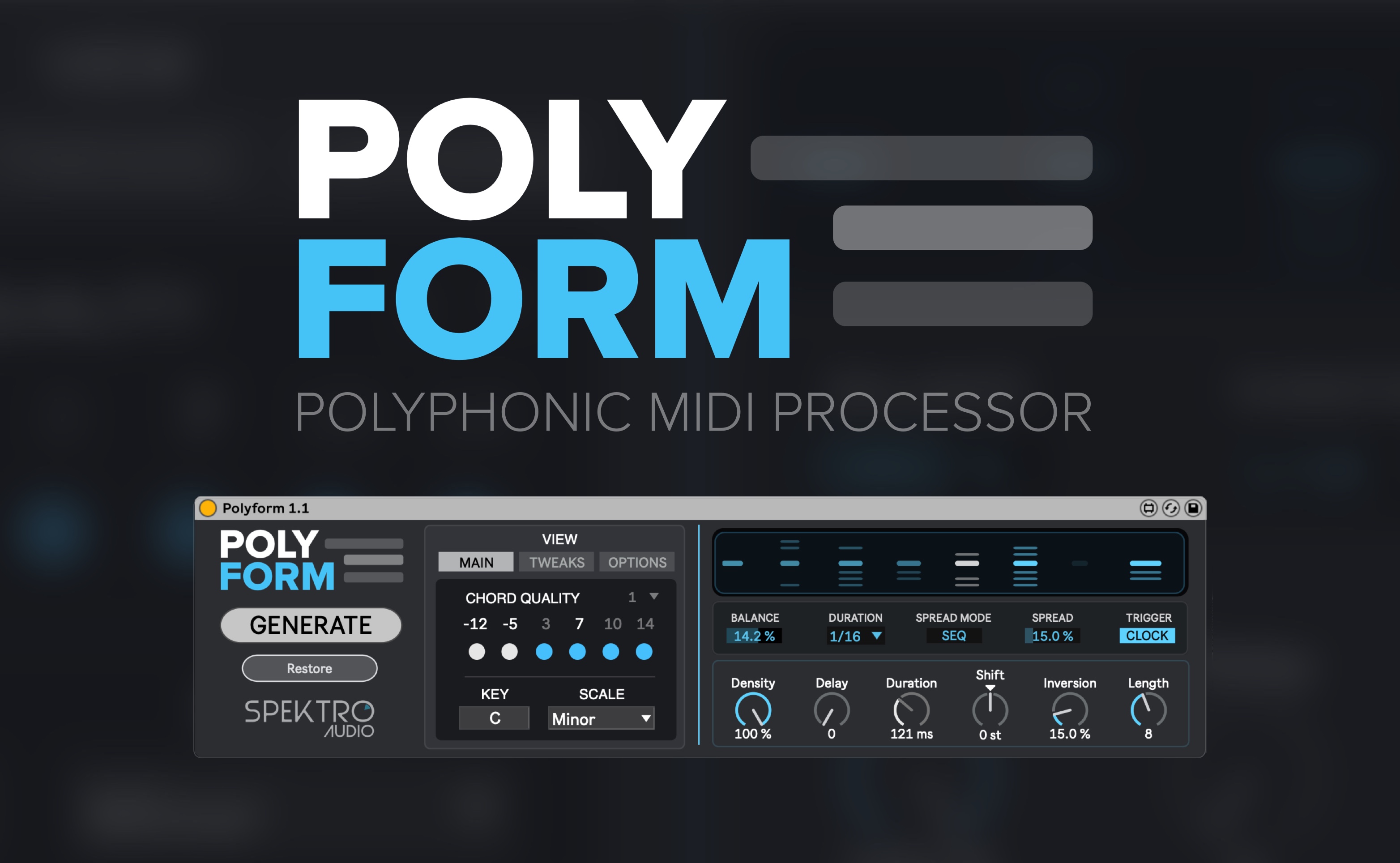 | Description: | Polyform is a Max for Live polyphonic MIDI processor that can listen to monophonic melodies and basslines and generate a polyphonic response algorithmically. While Polyform is not designed to replace tradicional chord progressions, it's capable of generating rhythmic polyphonic sequences and counter melodies based on other sequences and reacting to changes in those sequences automatically. Polyform generates it's results by matching incoming notes to an algorithmically generated sequence. The user can then manipulate and interact with the results in real time via parameters such as Delay, Density and Length, as well as change some of the algorithm settings used by Polyform to generate it response sequences via the Tweaks tab. FEATURES: - Tweakable Algorithm - 13 Scales - Chord Quality control – Control how Polyform generates chords - Randomized chord inversions - Spread – Add delays between notes in chords - Balance – Control the note length of chords vs single notes - Adjustable note duration – Set note duration to a specific value or to time divisions - Post Quantizer - Non-Destructive Pattern Manipulation - Pattern Visualizer - Auto variation for Note Length and Velocity - Presets |