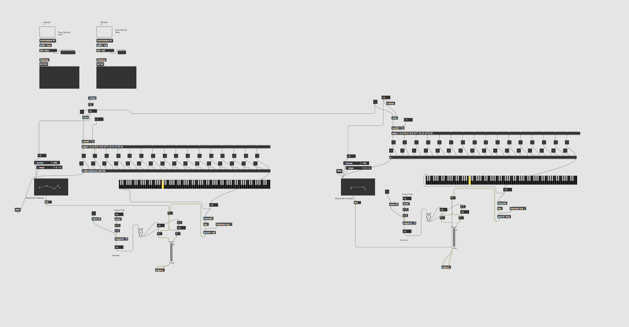 | Description: | This is a simple two-tier 32-step sequencer, with the ability to pan both 16-step sequencers independently and control the rate at which they alternate in stereo. Simply drag and drop your chosen samples into the labeled boxes and program the desired sequence by activating the gate toggles to allow the signal flow to trigger the corresponding midi note. The patch also has a filter envelop so you can manipulate the sample as the sequence is running live, this is particularly useful for glitching out the sounds. |
