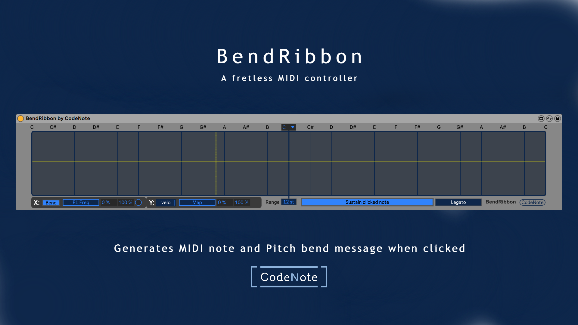 | Description: | A big pitch bender with pitch scaling that also triggers a note when clicked and combined with an XY controller. This makes it similar to playing Ondes Martenot -- a fretless pitch controller. The interface of BendRibbon is carefully crafted to make it feels natural. BendRibbon also works with touchscreen. Watch the video here! https://youtu.be/B0mkxKlNhVY |