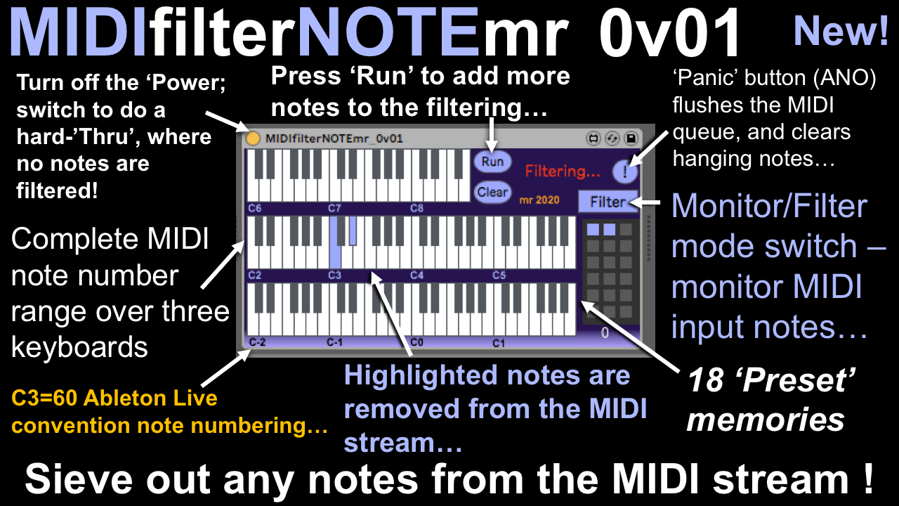Description: MIDIfilterNOTEmr is a MIDI note filter or sieve - not the more usual 'filter this type of MIDI message' device. You highlight notes on the graphical keyboards and these noes are then removed from the MIDI stream as it passes through the device. A 'Monitor' mode allows incoming MIDI notes to be viewed - so you can see what to filter out!