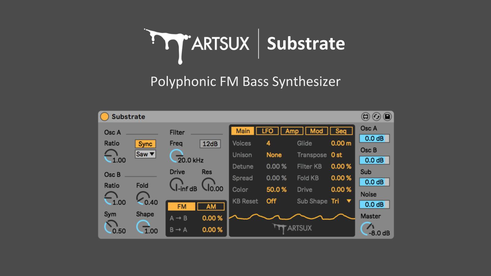 | Description: | Substrate: Polyphonic FM Bass Synthesizer. This minimal yet powerful Max for Live plugin was built to make West Coast style synthesis accessible to modern producers and sound designers. Substrate features a complex oscillator with an analog-modeling wave folder, FM and AM Buss with cross-modulation, a low-pass filter with zero-delay feedback drive and in true West Coast fashion, a 5 step sequencer with variable trigger modes. As well as more modern features like linear beat frequency tuning, stereo unison and oscillator keyboard reset. [ Video Demo: https://youtu.be/PLXbc-LyTKI ] |