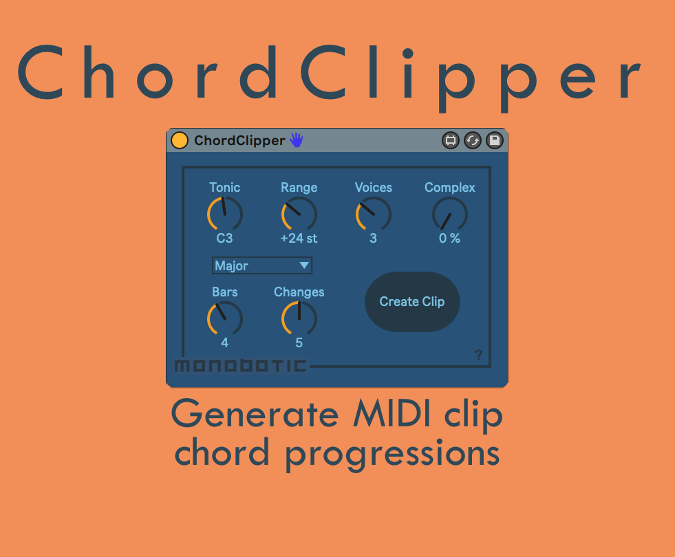 | Description: | ChordClipper uses basic music theory to generate chord progressions and write them instantly to a MIDI clip. Demo video: https://www.youtube.com/watch?v=zQeHKk27GaA The CREATE CLIP button generates a new MIDI clip in the highlighted slot of Live’s session view. ChordClipper will overwrite any notes if there is an existing clip. This allows ChordClipper to be used 'on the fly' to create new progressions while playing live. TONIC sets the key and lowest root note of the generated chord progression. BARS sets the length of the clip loop immediately. CHANGES sets the number of chord changes within the clip. RANGE sets the highest possible note relative to the tonic. VOICES sets the maximum number of notes in a chord. COMPEX affects the chord structures. Low values will produce simple triads with some 7th and 9th chords. Higher values will create more exotic and inverted chords. If COMPLEX is high and RANGE/VOICES is low, the generated clips are more likely to have gaps and single notes playing. Requires Ableton Live 10 & Max for Live 8 |