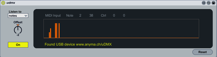 | Description: | Control the uDMX open source usb-dmx interface directly from within live. For more info about the udmx, visit http:www.anyma.ch/udmx |