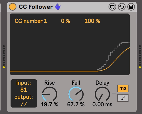 | Description: | Takes the functionality of the classic m4l Envelope Follower to midi CC passing through the device, allowing you to smooth out and delay the movement of a CC number. Enjoy! |
