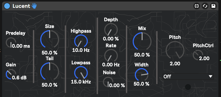 Lucent is a reverb which was built in [gen~] consisting of two FDN matrixes with possibilities of pitchshifting the reverb tail which effect is known as "shimmer". The FFT pitchshifting algorithm is build on the "multi-channel" way of the sound processing so this provides deep control of the pitch-shifted tails with different modes and two parameter knobs for pitch control. Two modulation modules were added so the size of the space could be changed dynamically and filled with noise to make your reverb sounds more brushy/crunchy. Also with two cool filters you can EQ your reverb sound, cutting low and/or high frequencies. On the last stage Lucent deals with the "width" control which allows to control the stereo effect of the reverberated sound.