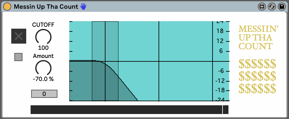 Messin’ Up Tha Count is a useful tool for creating filter and phased breaks. The filter section is based off of an Akai s2000 filter which was used extensively in classic Jungle production. The device also features a phase switch that can move the signal up to 5x out of phase, as well as a beat repeat switch with the quantization based on a boolean gate. This is useful for creating random based stutters that may or may not be rhythmical with each press! If you listen to Freddie Gibbs, you know what this is all about. |