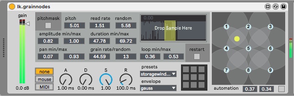 | Description: | Mac OSX only. Save 9 presets of granular synth parameters and interpolate between them using a 2D node space. Makes it possible to manipulate many parameters simultaneously using simple intuitive mouse gestures. Comes with a glitchy sample and 9 presets loaded, so after installing just click in the node space to start making crazy sounds right away! *** update mar 7, 2021 - v.1.1: presets are now stored with the live set without having to save or load a .json file. you will still be prompted to save the .json before quitting the set but it's not necessary. however doing so will allow you to reuse the presets in other sets or swap different presets in the same set. |
