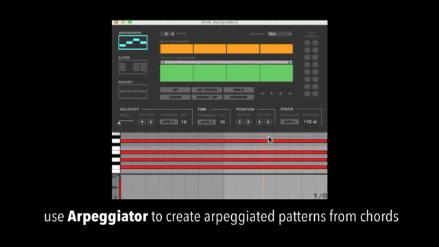 | Description: | Slice and dice your MIDI like a ninja! MIDI Manipulator is a device that adds advanced MIDI manipulation capability to Live, making it easy to quickly create arpeggiated patterns, chop notes into interesting rhythms and create accelerating and decelerating note sequences. All directly printed into the MIDI clip. - Use Arpeggiator to automatically create arpeggiated patterns from selected chord notes. - Use Slicer to chop selected notes into multiple segments for interesting polyrhythms. - Use Ratchet to create MIDI manipulations that accelerate and decelerate. - Humanize note timing and velocities. - Invert chords, shift octave, and stack notes at interval. - Store manipulation presets and apply them to the selection with a single click. Compatible with Live 9/10, and Max 6+. More info here: http://tetmusic.com/midi_manipulator_features.html Feature changelog: V1.3: * added Legato feature. Unlike Live's clip legato, you can choose whether notes should overlap or not. This is useful for instruments that implement sampled legato transitions on overlapping notes. * added scribble strip for naming manipulation presets |