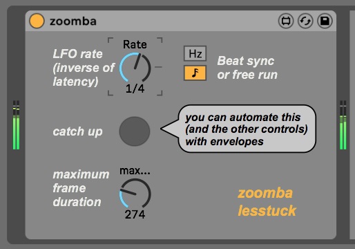 | Description: | In 2020 we spent a lot of time in Zoom meetings, and I was intrigued by the way audio degraded when the network connection was bad. It was obviously an FFT-based algorithm, but done well. I liked the way it would freeze frames, and when the connection improved, it would play all the delayed audio really fast to catch up. zoomba is a phase vocoder delay, which records FFT frames at the regular FFT rate, but you get to decide how fast those frames get played back. Playback can be beat-synced or defined as frequency. With the initial value of 0, the device should pass reasonably clean audio, playing back frames in sync with the FFT. A slow LFO plays the frames back more slowly, creating a temporal backlog in memory. Clicking the “catch up” button plays the backlog back quickly. Furthermore, when the LFO is very slow, one can vary the maximum frame duration to choose between legato with a long maximum frame size or staccato with a short one. Try it with speech, increasing the latency by decreasing the LFO rate, try catching up, and try small and large maximum frame durations. It's a simple effect, but it may help us remember a year in which much of most human speech we heard was passed through a nice phase vocoder delay. |