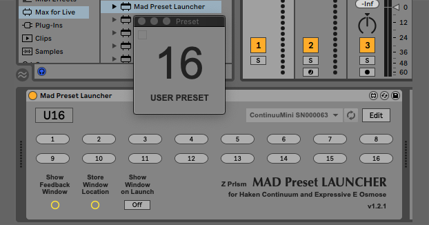 | Description: | The Mad Preset Launcher is a super easy-to-use Max For Live utility for remotely launching presets on the Haken Slim Continuum, Continuum(w UM-ONE), ContinuuMini, EaganMatrix Module and Expressive E Osmose. The latest version requires the connected instrument be updated with Haken Firmware version 9.9x or greater (including 10.0x). The device features 16 slots which can be assigned to any user preset or factory default system preset in a connected instrument. By default, the 16 available slots are assigned to User Presets 1 to 16 on the connected instrument. To change the values click the EDIT button. In EDIT Mode, click and drag a preset slot to scroll through values, or click the up and down arrows to step through values. If more than 16 preset assignments are needed, it is possible to chain together additional instances of MPL on the same MIDI Track. It’s even possible for different instances in the chain to be assigned to unique instruments. For example, connecting two Continuums, or a Continuum and Osmose to the system is possible within a chain of Mad Preset Launcher devices. The preset slot triggers can be mapped to any external controller using the standard methods in Ableton Live. In Edit Mode, Clicking the L button next to a preset slot will populate it with the preset currently loaded in the connected instrument. This is especially important for assigning system presets. (see notes below) SETUP: To perform standard Preset Launching on connected hardware, the connected device’s MIDI port needs to be enabled for Tracking MIDI Output in the MIDI Ports section of Ableton Live Preferences. To use the Preset Learn Feature of MPL, The connected device’s MIDI port needs to be enabled for Tracking MIDI Input in the MIDI Ports section of Ableton Live Preferences.** Important Notes: Mad Preset Launcher is a Max For Live MIDI Device for use on a MIDI Track. In the Ableton Live Session, On device initialization, MIDI Routing for the track is automatically set to “No Input”. There is no need to setup MIDI Inputs and Output device on the MIDI Track. The M4L automates these parameters changes dynamically to prevent MIDI feedback loops in the connected hardware. Preset slot assignments and instrument name is stored to the Ableton Live Session. Save the session to save changes in the device! Older Continuums will require the Roland UM-ONE USB-Midi-interface in addition to Haken Firmware version 9.9x (compatibility for older Continuums still in development at the time of this writing). Always ensure the Haken or Expressive E instrument is attached to the system before instantiating the Mad Preset Launcher max For Live Device. Mad Preset Launcher will auto-detect any compatible devices and auto load if only one compatible device is connected. If there are two or more, the device will need to be selected from the device menu. ** It’s recommended to disable the MIDI Input port for the connected hardware when there is no need to use Preset Learn or after completing the programming for preset assignments. Due to the variations in system presets across the compatible instrument, the system preset numbering scheme in Mad Preset Launcher does not align with the numbering scheme in the instrument. It is for this reason, MPL features the “preset learn” function. NOTES for Expressive E OSMOSE: In the MPL device on Mac systems, the selected MIDI port must be set to "Osmose Port 2". In current version 1.2.3 there is a communication issue preventing Macro Names (Custom preset parameters) from updating on the Osmose UI display when presets are changed using MPL. Also, the default preset selection of 1 to 16 corresponds to User Presets, not System Presets. To select System Presets, the "Preset Learn" function will need to be used to "capture" the currently loaded system preset and store the correct corresponding System Preset ID into the launch button. Osmose connected to Ableton Live on Windows systems is not yet fully supported in MPL version 1.2.3. Support is coming is a future update. Feedback Window: The device also features a floating window to reflect the most recently triggered Preset and Preset type (USER or SYSTEM). The window can be set to appear automatically at Set launch time or can be opened manually. It is possible to store the location of the Feedback Window with an Ableton Live session. Click the "Store Window Location" button and the next time the session is launched, the floating window will appear where ever it was saved last. ======== If you find this Max For Live device useful, please consider making a donation to support and sustain its development. Donation links are located inside the M4L device when in Edit Mode. There are new features planned for future updates, including Preset name population, Instrument specific category numbering, and expanded detail in the Feedback Window, but this development will require more time and user support. |