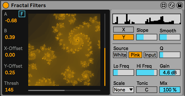 | Description: | FREE FREE FREE device. Fractal Filters uses Julia Set fractals to create a set of amplitudes for a 50 band filterbank. It does so by taking a "slice" of the 2D image (either a single row or column) and using that list of values as the filterbank amplitudes. Noise or input audio is sent through the filterbank. The Q of the filters can go really high as to create tones if desired, and there are scale and tuning options for the filterbank. You can also drop Scala files (.scl) on the Scales menu to use custom tunings! THIS DEVICE IS INTENDED TO BE USED WITH MODULATORS. Otherwise, it will have no dynamics. So map away and have fun! NOTE: Although it's free, if you purchase it then 100% of the money will be donated to various causes, reach out to me if you want to know where the money is going now! Video here: https://youtu.be/498dUs3LGZo *Update* - You can now drop scala files (.scl) to use your own tunings! Just drop them on the "Scale" UI object. TO INSTALL: drop the unzipped folder into this folder: ableton/user library/presets/audio effects/max audio effects NOTE: There is currently a bug in Live with hot-swapping presets that have modulators, such as the LFO device. So to make sure the presets are loaded correctly, always hot-swap them twice! Although Ableton may have fixed this issue by the time you get this device :) Issues etc: dillonbastan@gmail.com more: dillonbastan.com |