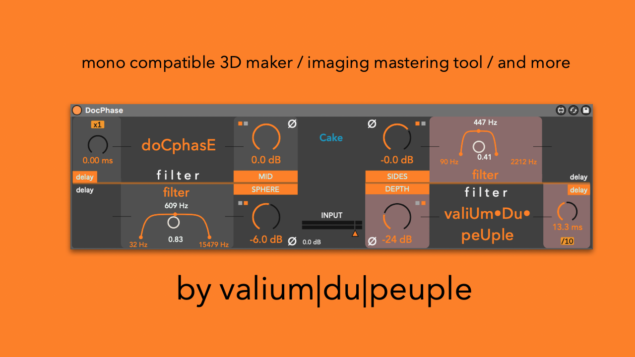 | Description: | DocPhase is a M4L reproduction of the best spatialization/stereo widener/MS tool ever: DrMs by Mathew Lane. No other plugin does what it does; it made me crazy I had to find out what was happening. Check this DrMs video demo if you haven't yet heard what's it's capable of! It's mind-blowing imo: https://www.youtube.com/watch?v=QZC9_4brssY&t=1s You can now enjoy its magic in Live and from your Push thanks to its spot on dynamic mapping for 1/10th of the original plugin's price. enjoy! RELEASE NOTES v1.3: - filters and delays can be turned on/off and monitored from the main view (Chocolate view) - general code optimizations - fixed: phase invert was not recalled properly v1.2: skipped v1.1: - added an Input gain fader (click the Input/Output text-button to switch between them). This helps a lot to prevent clipping. - parameters are now hidden when inactive. - fixed delays having 1sample of delay when actually set to 0. For Live 9/10/11/12 Max 8 minimum |