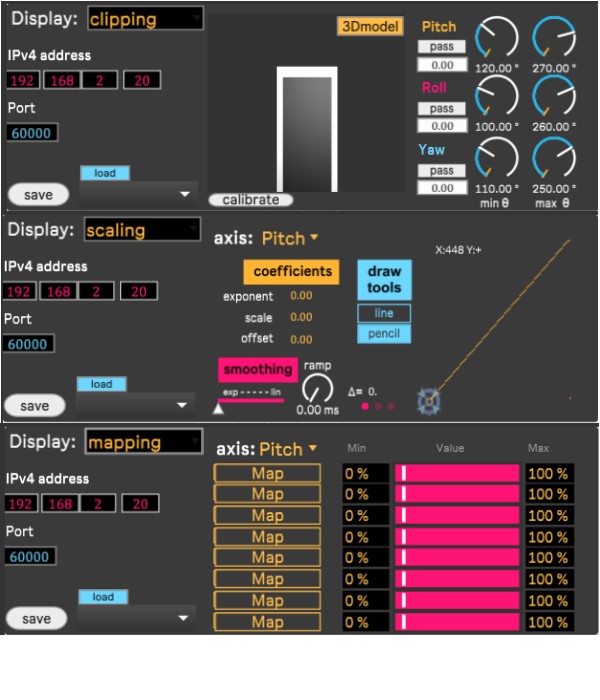 | Description: | buggy -- see below GyroMapper takes the data from your iPhone or iPad and brings it into Ableton Live, allowing you to map each axis of rotation to any live device's parameters. If a device parameter can be mapped to a macro control, it can be controlled by GyroMapper. GyroMapper was intended for use by live electronic and electro-acoustic musicians, as well as a utility for producers who want to to automate parameters faster and more efficiently. Due to GyroMapper's customizability and the sensitivity of your phone's gyroscope sensor, it also has great potential for use in experimental music. -- the option to map to ableton live parameters is not functioning, I do not currently have an Ableton license and cannot debug it. Feel free to pick through it for the relevant code it if you want, it should work fine up until the "mapping" bpatcher. |