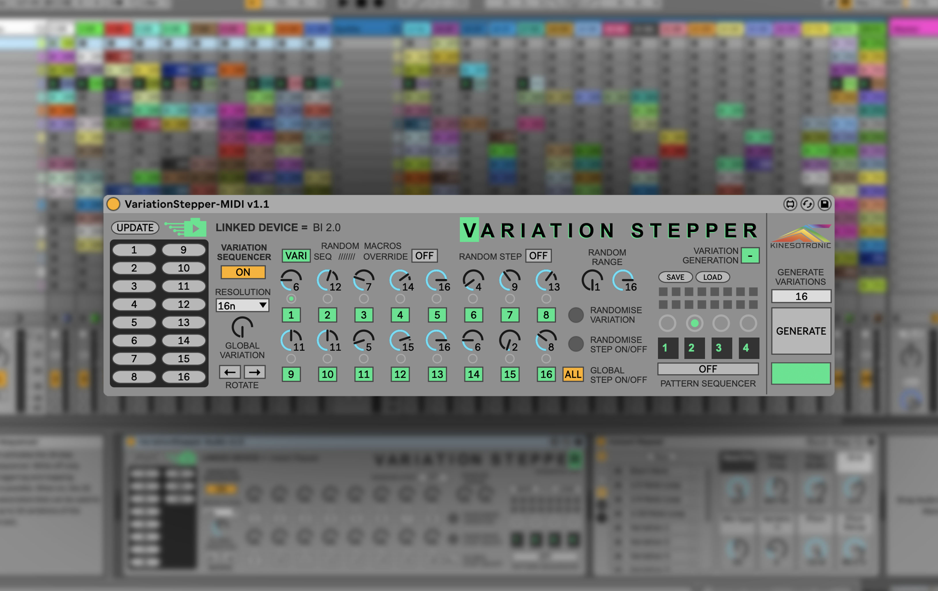 | Description: | Variation Stepper is a device for MIDI mapping and sequencing up to 16 rack variations in Ableton Live 11. Inspired by how we use Malekko Heavy Industries' - Voltage Block in our modular rigs and by Krazy Baldhead's awesome Smooth Automator device. Features include: 16 MIDI Assignable Variation Triggers 16 Step Variation Sequencer with randomisation options, pattern rotation, selectable timing resolutions and global controls 16 slots to store variation sequencer patterns Flexible pattern sequencer for chaining and repeating patterns in any order Just place Variation Stepper to the left of any rack to jump between up to 16 variations in ordered or chaotic sequences. Updated to version 1.1: • Automatically populate linked device racks with up to 16 randomly generated macro variations. • New Macro Randomisation and sequencing options. |
