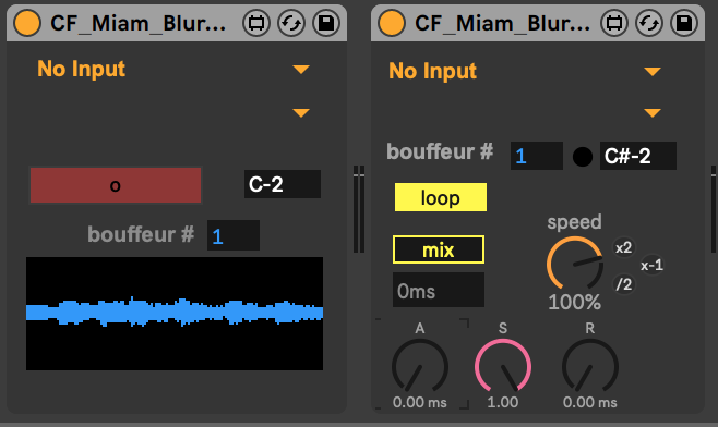 | Description: | Miam & Blurp is a flexible buffer recording and playing system. There are two devices : "Miam" eats audio "Blurp" vomits audio. Miam's settings : Drop it where you want audio to be eaten. Select a "bouffeur" (buffer) number. Select the Midi input and the Midi note that will trigger the recording. Blurp's settings : Drop it where you want audio to be vomited. Select a "bouffeur" number corresponding to a Miam device somewhere. Select the Midi input and the Midi note that will play the recorded material. "cut" will cut incoming sound when vomiting (with definable fade) and "mix" will let the audio go through. "speed" is automatable. With negative values, it will play the content backwards, starting from a definable starting point. ASR enveloppe available as well. "loop" turn on looping on playback. Happy vomiting ! Changes from v1 : Buffer size now adapts to the recording length, so looping is possible, and reverse playback always starts from the end. Added looping playback. Added multiplier buttons for speed. |