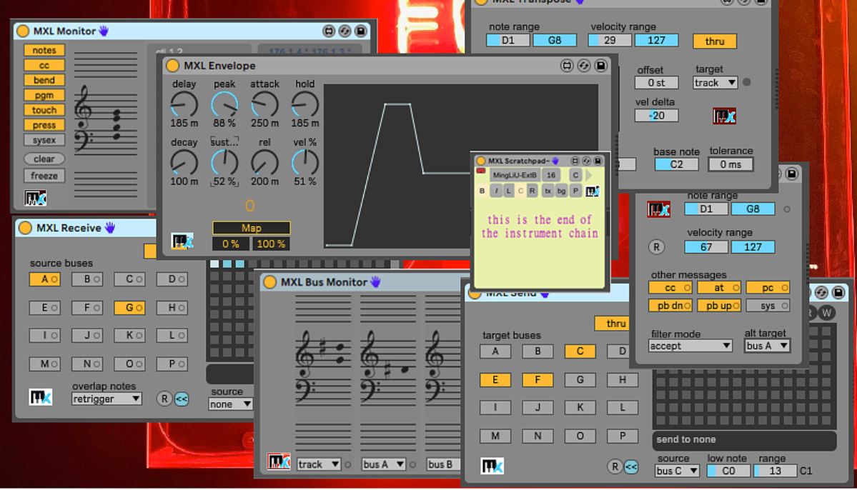 | Description: | Eight *free* M4L MIDI devices for Ableton Live 10 and 11. MXL MONITOR: keep track of incoming MIDI messages (including Sysex), see the actual bytes, filter by message type, and more (better than Live's built-in device) MXL SEND and MXL RECEIVE: use 16 buses to send MIDI messages from one track to any number of other tracks, save bus configuration in presets and recall them automatically. MXL BUS MONITOR: see what messages flow through each bus MXL FILTER: accept or discard notes or other MIDI messages, define pitch or velocity ranges, send a note subsets to specific bus. MXL TRANSPOSE: transpose incoming notes, with synchronized behavior in different tracks. MXL ENVELOPE: control any Live parameter with an DAHDSR (Delay-Attack-Hold-Decay-Sustain-Release) curve (more flexible than the standard ADSR envelope) MXL SCRATCHPAD: add a comment to tracks and devices, with fonts and colors (two versions are provided, for MIDI and Audio tracks) --------------------------------- MXL FREE PACK is a subset of MXL PACK, containing 40+ MIDI M4L devices: --------------------------------- HOME PAGE: https://www.midi2themax.com/mxl-pack USER GUIDE: https://midi2themax.com/mxl-pack-manual-1-00 |