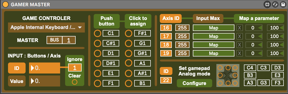 | Description: | Game Controlers as Ableton Controler Part.1 of 6 / Gamer Collection A master + 5 optionnal plug-ins to use game controlers as Ableton Live controlers. Works with almost every USB game controlers (gamepad, joystick, wheels,..) and other ones with USB adaptator, with keyboards and mouses too. Gamer Master is necessary to send game controlers datas to others plug-ins. Un plug in Master + 5 autres options pour utiliser quasiment tous les controleurs de jeu USB (ou playstation,.. avec adaptateurs USB) en controleurs pour Ableton. Vous devez utiliser au moins un plug Gamer Master pour qu'il envoit les données aux autres. Details Gamer Master : selection de la manette ou du joystick, 12 boutons + 8 coins de la croix directionnels assignables à une note MIDI, 4 axes assignables à un parametre de Live Gamer Tester : visibilité globale des données envoyées par le controleur (certains boutons ou axes envoient plusieurs données différentes simultanées) Gamer Axis Splitter : permet de diviser l'axe d'un joystick en 2 assignations différentes, un parametre à droite et un autre à gauche par exemple Gamer Buttonsparameter : permet d'assigner 6 boutons à des paramètres avec une valeur "on" et une valeur "off" Gamer Matrix : permet d'utiliser les 2 axes d'un joystick pour créer une matrice en 2 dimensions 5 par 5, pouvant ainsi déclencher 25 notes différentes selon la position du joystick Gamer Step by Step : permet d'assigner 2 boutons à un même paramètre pour le piloter pas à pas (+ et -), on peut par exemple changer d'octave sur un instrument en l'assignant à un plug-in MIDI Pitch avec des pas de 12 |