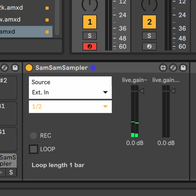 | Description: | FIXED: input list not populating properly. This is SamSamSampler, a Max for Live instrument designed primarily for live performance. It lets the user quickly record and play samples as one-shots or tempo-synced loops. This is a limited beta (max 100 unique downloads). It's currently under development, so you're welcome to download it for free and play around with it. By supporting my work with a donation of your own choice, you will receive future updates of this device for free! Here's how the device works: first, the user records a segment of desired length of real-time audio from the selected source (external input or any track, including Master). Then, the sample can be triggered by a MIDI note-on message as a one-shot or a loop. There are a few key things to know about this device: The sample will be triggered in Gate mode, meaning that it will stop playing once it receives a note off message. However, if the player holds the MIDI note long enough, it will start looping. The loop isn't quantized to the Live grid, but it's still tempo-synced! The loop length is adjusted dynamically so that the whole sample fits in, but instead of looping out of sync, it loops again at the nearest bar duration. Thus, the user can perform in sync with the tempo without needing a click track! The recorded sampe may be any desired length - when looping, silence will be added at the end of the sample to make sure it stays tempo-synced. Multiple instances of SamSamSampler can be inserted in a drum rack; each record button must be mapped manually, while the incoming MIDI note corresponding to the drum rack will start the loop. I'm planning to implement the following features: sync to a desired length (beats/bars) toggle auto-expand loop length filter, pitch and ADSR controls waveform display UI improvements |