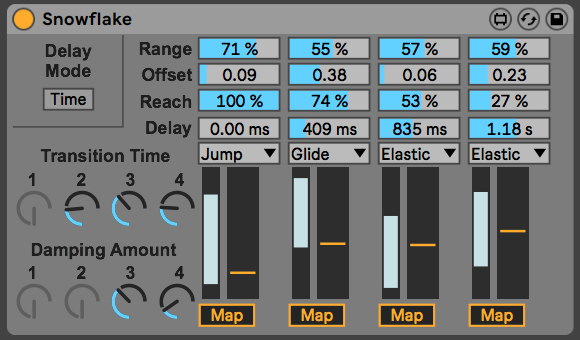 | Description: | 'Snowflake is a Max MIDI Effect for random CV generation, designed to make every note as unique as a snowflake. Every incoming MIDI note triggers 4 random values to be generated, which can be mapped to parameters in Ableton Live. Snowflake allows transitions between values to be instant, smooth, or ‘elastic’, with intuitive and easy-to-use controls for sculpting your CV output to perfection.' This is 1 of 4 devices I've made as a uni project, and am now looking for feedback on. All 4 are made to be super quick to use - check the Quick Start section in the manual to get them up and running ASAP. I'm entirely self-taught so any comments are appreciated! --- v1.1: - Bug fixed where not all controls were showing up for some users. |