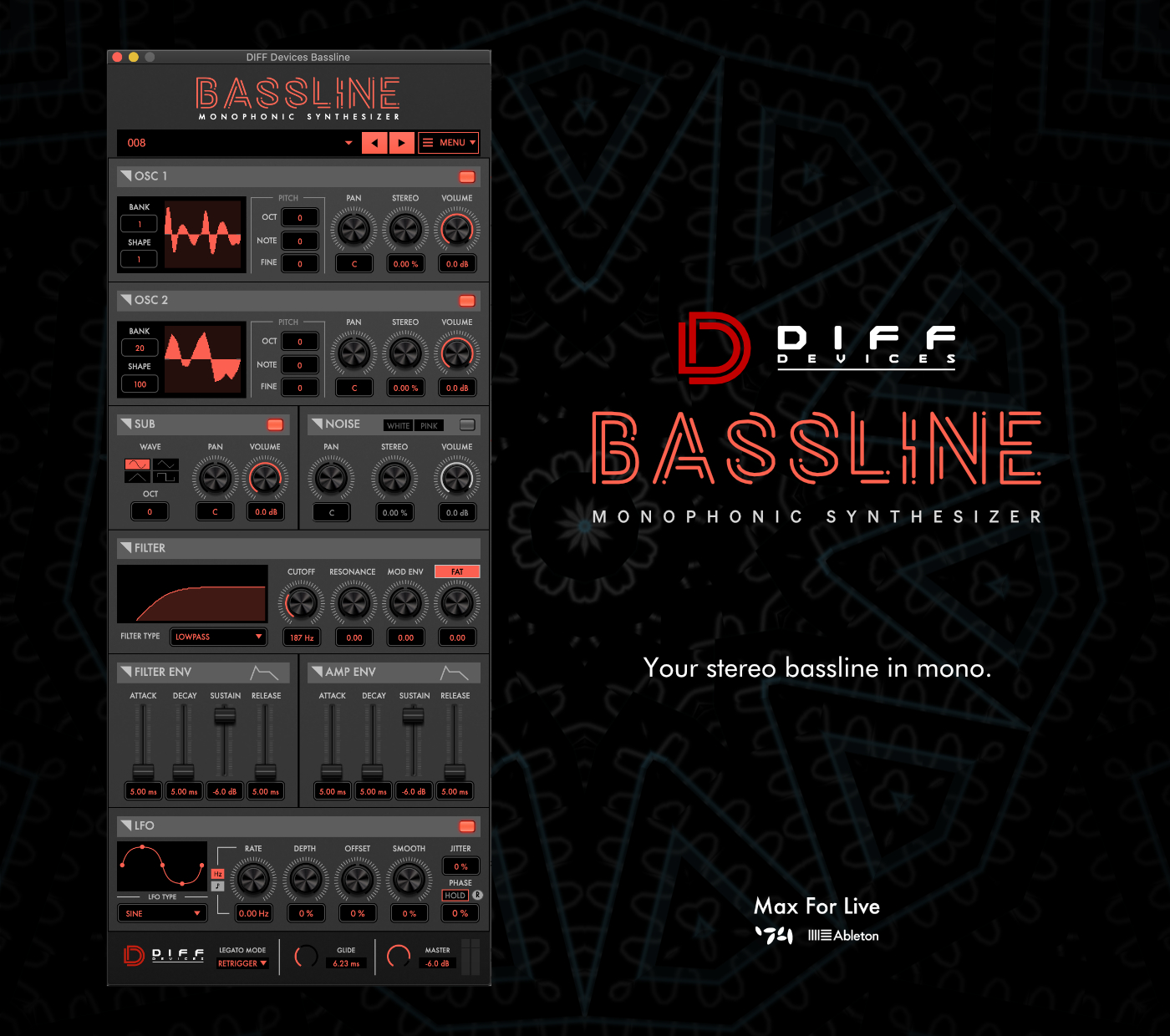 | Description: | DIFF DEVICES - BASSLINE YOUR STEREO BASSLINE IN MONO. Ever wanted a BASSLINE Synth in stereo, but that works in mono at the same time? So you don't need to search anymore. BASSLINE is a WAVETABLE SYNTH (with 2000 different waveforms), a SUB SYNTH to make that perfect low end and a NOISE SYNTH to make that crunch on top. FEATURES: - PRESET MANAGER (SAVE PRESETS AND BANKS) - RESIZABLE GUI - FLOAT WINDOW - 4 OSCILATOR SYNTHESIZER - 2 WAVETABLE (2000 Different Wavetables) - 1 SUB OSCILATOR - 1 NOISE OSCILATOR - 4 FILTER TYPES WITH “FAT MODE” - HIGHPASS - LOWPASS - BANDPASS - NOTCH - FILTER ENVELOPE - AMP ENVELOPE - 7 LFO TYPES - LEGATO MODE - GLIDE - PRESETS * Only works in Ableton Live with Max instaled * It Requires Ableton Live V10.1 (minimum) |
