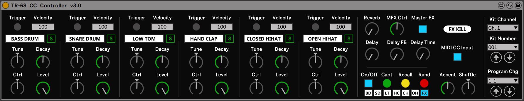 | Description: | MIDI Controller device for Roland TR-6S. Features: Send and receive all possible MIDI data to and from the TR-6S. Controls for every MIDI-available feature including FX. Mute and Solo buttons for each instrument. MIDI CC in button allows dials on device to respond to motion data from the TR-6S. Easily change patterns using the program change selector or scroll through patterns using the arrows. Randomise button instantly sets parameters to random values. Capture button stores the parameter values. Recall button instantly reverts back to the captured position. Toggle buttons to include or exclude instruments or the FX from the Capture, Recall and Randomise buttons. FX Kill button to instantly turn off all of the FX. Mappable trigger buttons for each instrument with velocity control for quickly testing sounds (if sending MIDI notes the standard way the TR-6S will respond to velocity anyway). All parameters are named and automatable from Live. Detailed README is available here: https://pastebin.com/7bwrFF79 -- -- -- -- -- -- -- -- -- -- -- -- -- -- -- -- -- -- -- -- -- Warning: Using more than once instance of the Device froze my TR-6S and I had to pull out the batteries to reset it. Only use ONE instance of the device in a session. My TR-6S was fine once I cut the power but I thought I had bricked it. It might not actually be at risk but it's better to err on the side of caution and not take the chance! -- -- -- -- -- -- -- -- -- -- -- -- -- -- -- -- -- -- -- -- -- Version history -- -- -- -- -- -- -- -- -- -- -- -- -- -- -- -- -- -- -- -- -- v1.0 - 2021-07-04 - Initial release. v2.0 - 2021-07-15 - Added missing label to Open Hi-Hat Tune dial. v3.0 - 2021-10-09 - Added Solo Buttons. - Added FX Kill button. - Added Kit change functionality. - Added Capture and Recall parameter buttons. - Added buttons to exclude instruments and FX from Capture, Recall and Randomise. - Removed Initialise button. - Updated GUI. - Updated README on Pastebin. - Reviewed and updated Hints and Info view text. v4.0 - fixed behaviour of program change arrows where they would increment the program on device load. Also affected Kit Change arrows. |