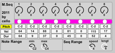 | Description: | A 8 Dials Note Seq. Use midilearn to controll with hardware. |