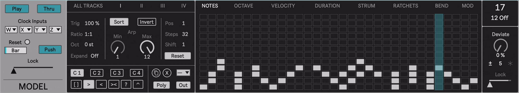 | Description: | Model is part of the SEEDS collection. An advanced polyphonic arpeggiator/sequencer that runs up to four independent tracks simultaneously. Featuring many of the same powerful controls from Polymath, Model sequences your incoming MIDI notes to create unique accompaniment patterns and textures, or surprising melodies that change with your note input. The device includes different modes for sorting incoming notes, including range limiting and inversion. The assignable outputs for each track allow for easy manipulation of complex orchestrations in real time. Tutorials and more info here: https://www.novelmusic.org/m4l/seeds |