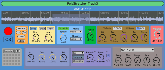 | Description: | Hi, This is a 10-note polyphonic sample player with independent time-stretching and pitch-shifting. Most of the controls are self-explanatory, at least audibly. I've updated all of the essential circuits with cybernetic components. I’ve also upgraded the filter to the Abl.DSP Meld Filter which has 14 different filter types and dedicated Envelope and LFO. Many of the knobs are extremely fine grained under the hood. Use the Shift key with the arrow keys or mouse to speed up or slow down the scrolling. Share and Enjoy |
