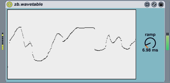 | Description: | zb.wavetable is a custom wavetable synthesiser. It allows the user to draw in a period of a custom waveform, which then gets used in a wavetable lookup oscillator. The table is used for inputting the waveform to be used by the oscillator. The ramp parameter can be used to control the duration of the amplitude envelope. |