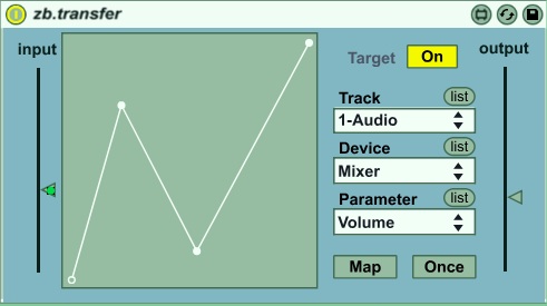 | Description: | zb.transfer Takes a slider as its input and generates a control signal based on a customisable transfer function. The motion of the input slider is used to read out a stored collection of values representing a transfer function. The resulting signal can then be applied to control any device parameter in the Ableton Live set. The transfer function table is user-editable. Breakpoints can be added to the line by clicking anywhere in the grey area. Shift-click on breakpoints to remove them. |