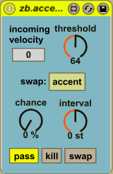 | Description: | zb.accentPass is another note stopping device that relates the probability to the velocity of the note. It is originally conceived to induce variation in the ghost notes of the snare drum while keeping the accented hits. If the velocity falls below the threshold than the probability of stopping it is it's distance below the threshold. Based on the same threshold accented or ghost notes can be swapped i.e. transposed. The chance and the interval of the swapping can be adjusted below the swap toggle. Incoming velocity and pass kill swap serve display purposes. |