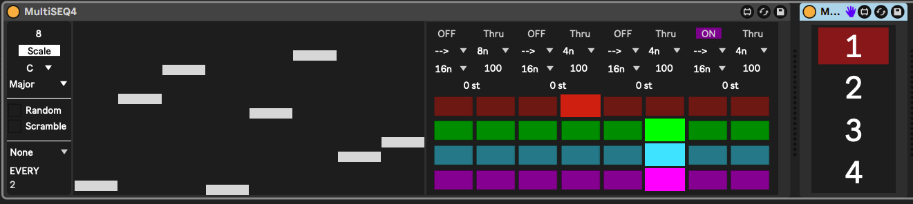 | Description: | 1.3 Added a Device setting to the Send/Receive so multiple Seqs can be used at the same time. Just Make sure "D" matches on each device. 1.2 -Sequencers retain values when resizing 1.1 ---Changed the Scale system to work better with Live 12, instead of Chromatic it can now just be turned off by clicking Scale. MultiSEQ4 is an up to 32 step sequencer with 4 playheads. Each playhead has independent direction, rate, note length, velocity, duration, transposition and gate. The playheads can be routed to the same track or another track with the included receiver in any combination. The main sequence can be randomized and or scrambled manually or every nth pass. It has Scale Quantizing with all available scales from Ableton. Most of the controls can be used with Push2 -Ableton 11 only- The scale will stay in sync bidirectionally with the current scale chosen in Live via a Push2 or a midi clip. I believe everything else will work with any version. If anyone has any suggestions or tips id love to hear them.Thanks |