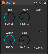 | Description: | This aims to recreate the Artificial Double Tracking (ADT) first pioneered by Ken Townsend at Abbey Road studios. The original effect uses two parallel tape machines out of sync (possibly using a varispeed control) to impart speed and pitch differences. When the signals are combined, the create a chorusing and widening effect. I used a smoothed (LPF) random signal as the delay modulation source. The Frequency of this can be adjusted, as well as the Bias, which in this case is the difference between the minimum delay value and no delay (0ms). The Depth is the difference between the maximum delay and minimum delay, which translates to the strength of the pitch shifting. A simple HASS widener can also be created with zero Depth, and Bias all the way up. The Width parameter controls the stereo image by panning the delayed signals inwards towards the center. Note that this does not effect the panning of the dry signal. Mix allows for a blend between completely dry to completely wet signals. ADT-2 is the "double" version of this plugin that uses separate delays for left and right, then mixed with the dry signal. See my uploads for ADT-1 if you'd like the classic effect with only one delay channel. Alternatively, with the Mix knob at 100%, you get an approximation of two unstable tape machines, which may be closer to the original effect. This was inspired by the Waves Reel ADT effect, which also included some tape saturation. This isn't so easy to replicate in M4L as it requires a magnetic hysteresis loop to model accurately. If you want a more tape-y sounding effect, I suggest pairing this with the free ChowTape plugin. |