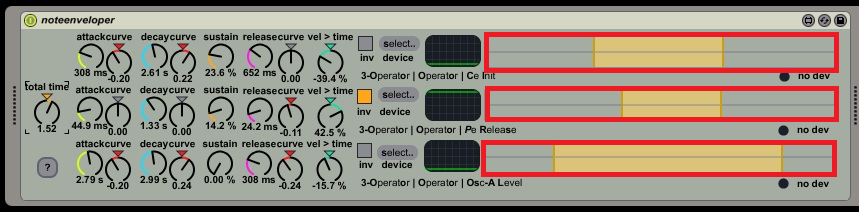 | Description: | This devices provides 3 seperate ADSR envelopes on a midi track. These 3 envelopes can each control any device parameter in your live set. attack is triggered by note-on release is triggered by note-off (might add a legato-mode) parameter range is set by using the range sliders highlighted in red on the screenshot. i think its self explanatory, but i could be wrong :) all comments welcome (3rd of January, 2012: device has been updated, due to reports of inconsistent behaviour) |