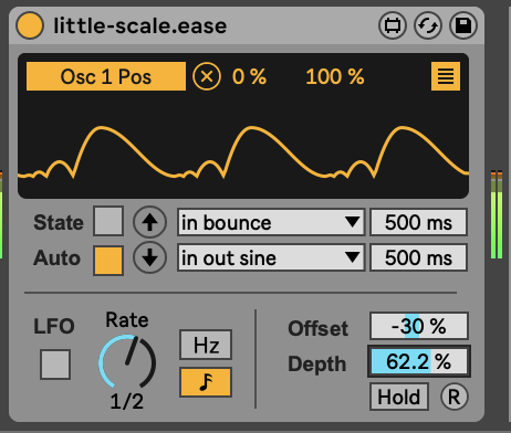 | Description: | An LFO that uses easing transition functions to move between a high and a low state. Can be set to sync or free rate, or automatically re-trigger at the end of the period. A different function and time can be set for the up slope and the down slope. |
