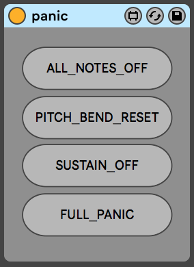 | Description: | Just a quick MIDI panic utillity that might be useful in certain applications with the following controls - ALL NOTES OFF PITCH BEND RESET SUSTAIN OFF FULL PANIC (All the above) Hope it helps someone! |